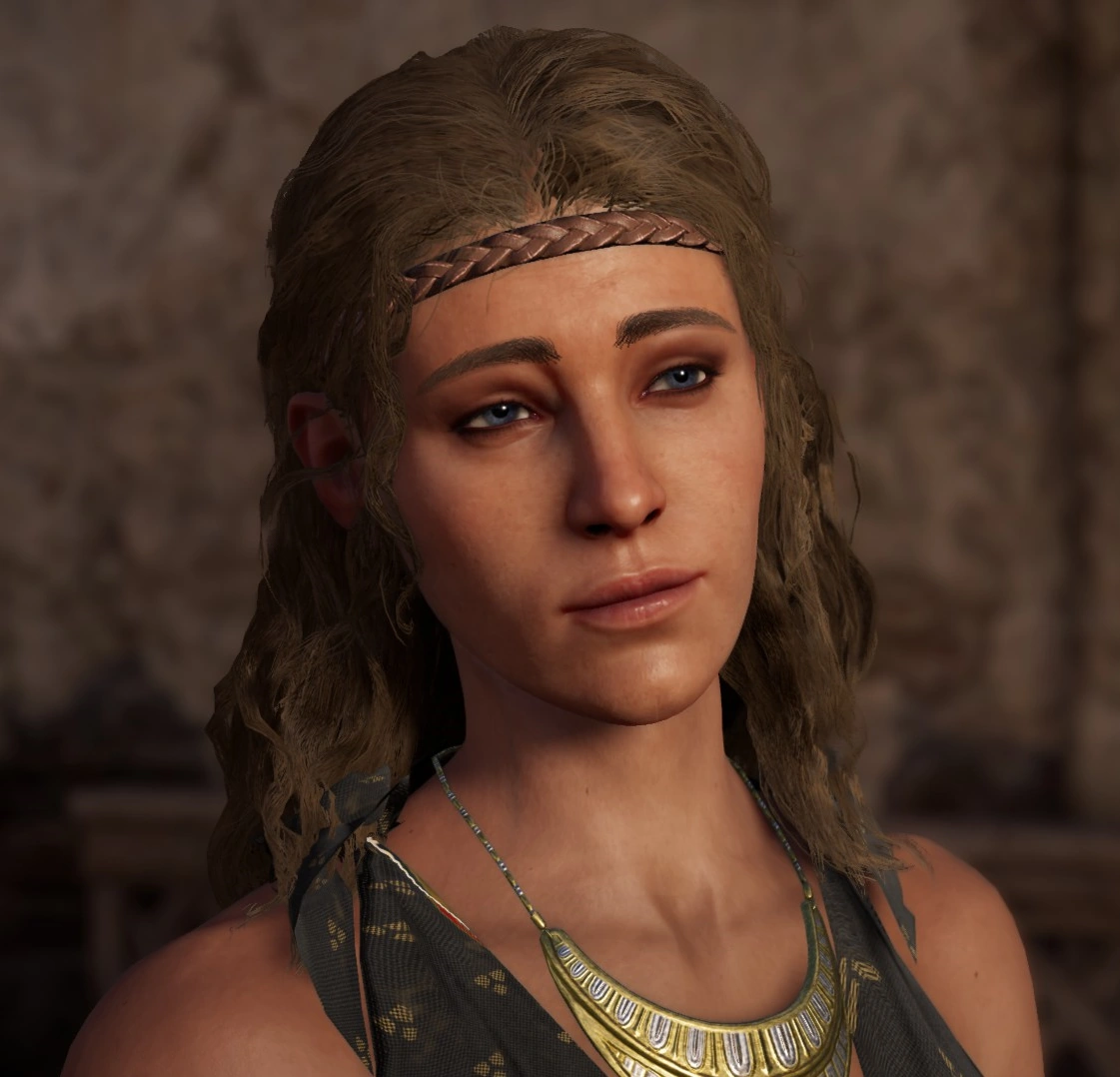 In 424 BC, the demagogue Cleon's right-hand man, Commander Rhexenor, threatened to harm Aikaterine if she continued to associate herself with Thespis, leading to the mercenary Kassandra rescuing Thespis from Athenian soldiers at the tavern and learning from Thespis that he could not perform without his muse, Aikaterine, in the wings. Kassandra tracked down Aikaterine, who mistook her for a customer, before learning of Rhexenor's location, the local garrison, from Aikaterine; Aikaterine agreed to attend the play if Kassandra dealt with Rhexenor and brought back his "little sword" (referring to his genitals) as proof. Kassandra slew Rhexenor and brought back his bandit sword, causing Aikaterine to laugh at Kassandra's misunderstanding, and she agreed to go to the play. However, she also flirted with Kassandra, and the two made love before Kassandra reminded Aikaterine of the need for her to attend the play. Aikaterine went on to attend the play a day later, and the massive success of the play destroyed Cleon's popularity.
