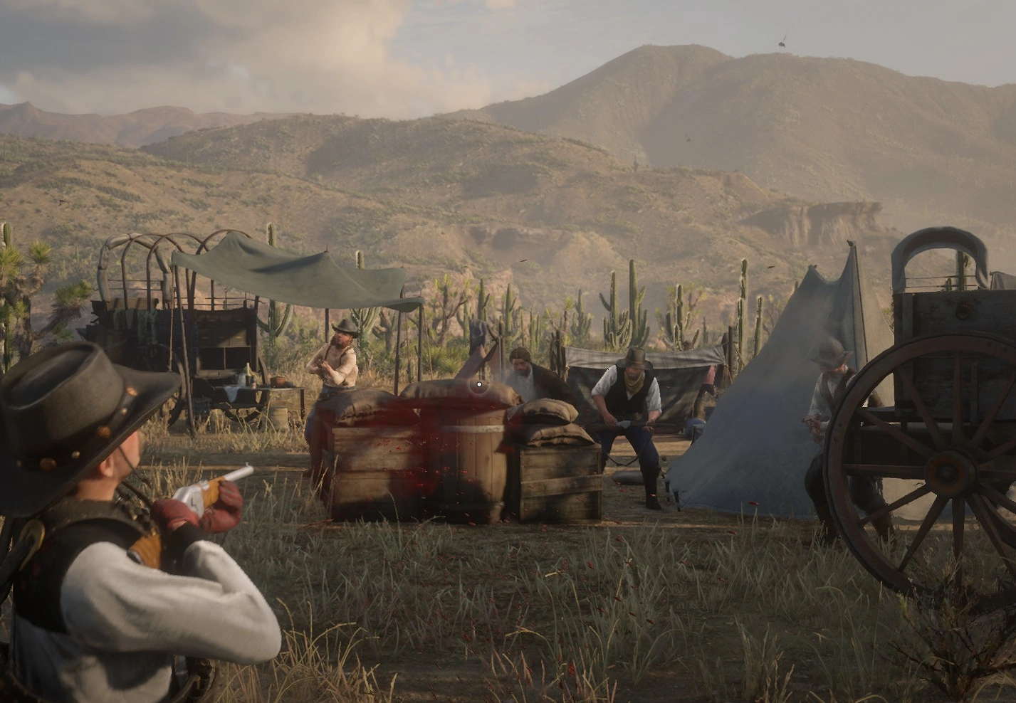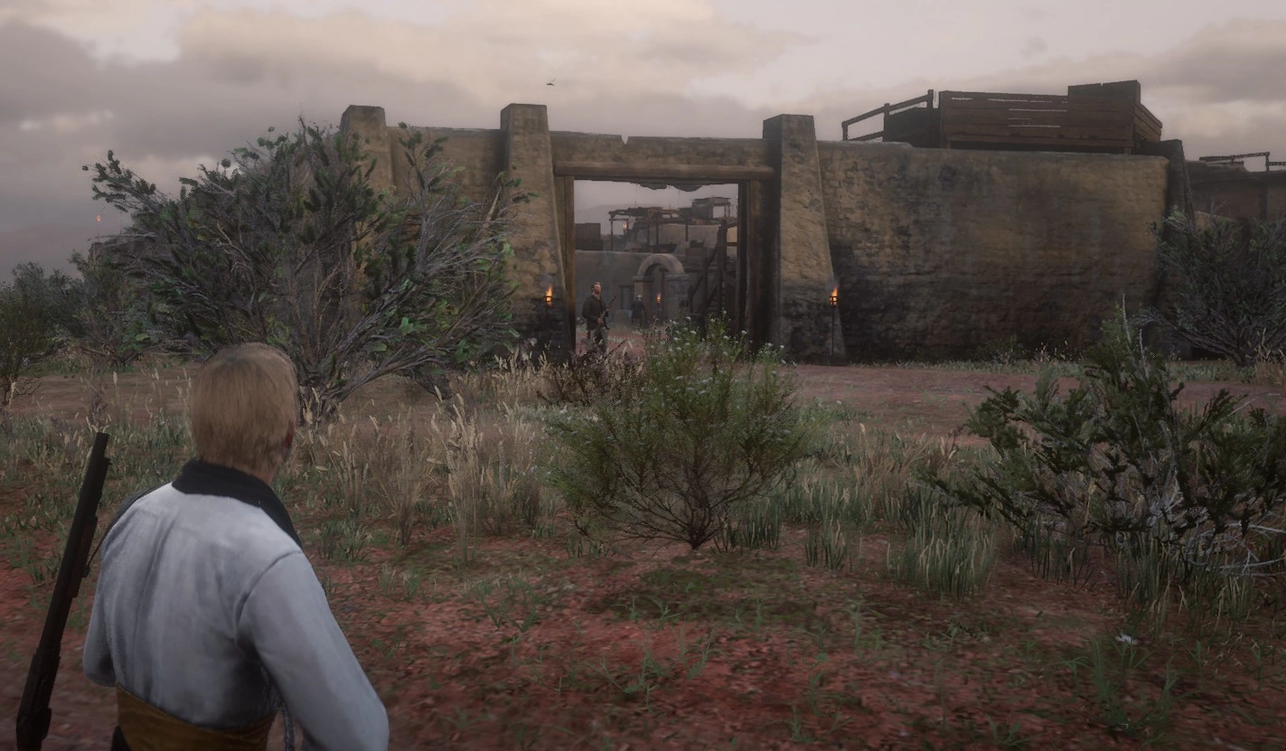 While riding out of Strawberry, he noticed six armed men camped out at Fort Riggs, so he entered the fort and investigated. This resulted in a shootout, with Arizona killing two men before taking over a Maxim gun and using it to gun down a few reinforcements. He then cleared the cabin of outlaws, and he looted their bodies and also stole unattended cigarettes and cocaine gum from the camp. Afterwards, he decided to go hunting in the open plains and in the Caliban's Seat valley, hunting California valley coyote and whitetail deer and selling their carcasses in Valentine.