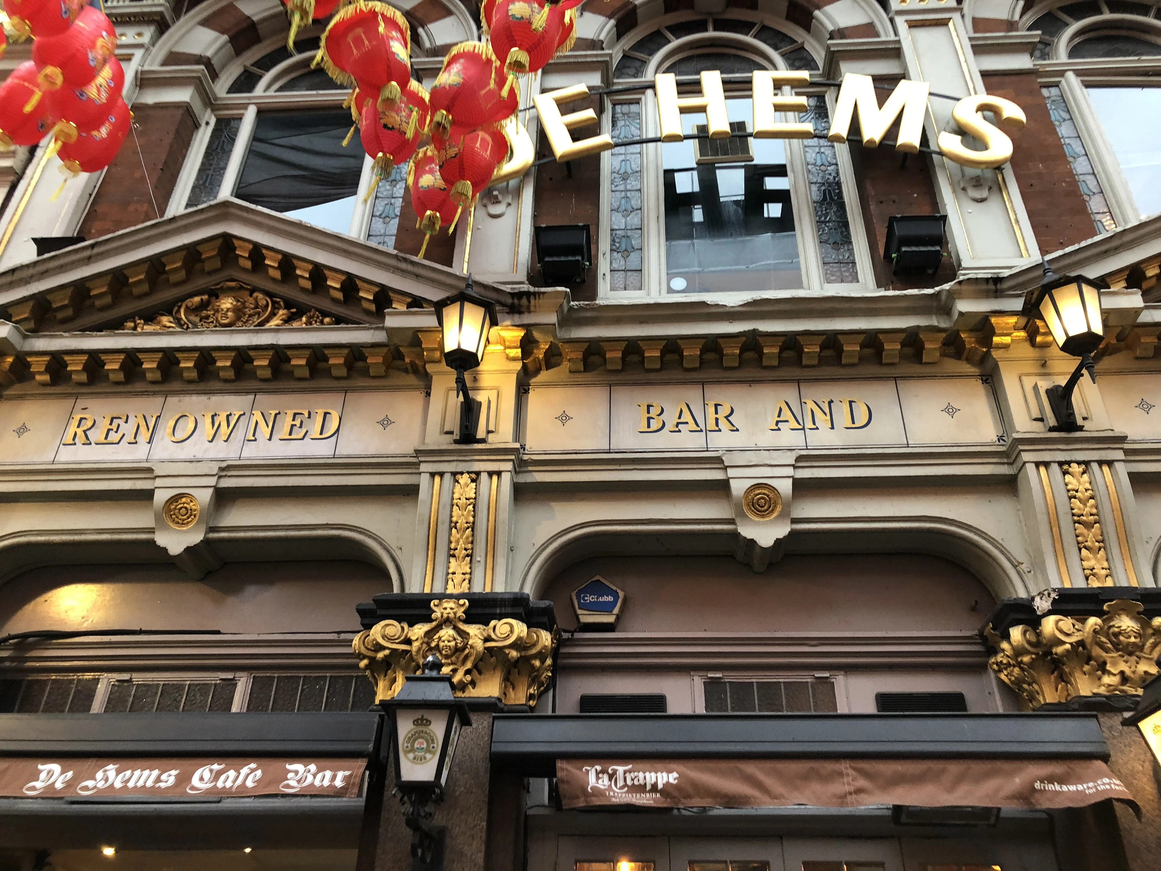 De Hems is a café, pub, and oyster-house located off Shaftesbury Avenue in Chinatown, London, England. The "Horse & Dolphin" coaching inn opened at the site in 1685, and it was rebuilt in 1890 as "The Macclesfield", named for its location along Macclesfield Street. The pub was soon leased by the retired Dutch sea captain "Papa" De Hem, and it became a renowned oyster-house. The pub became a hangout for gangsters in the 1920s, and, during World War II, it became the unofficial headquarters of exiled Dutch Resistance members. In 1959, "The Macclesfield" was renamed to "De Hems" in honor of the captain, and it became popular with music industry people during the 1960s. During the 21st century, De Hems became a popular place to follow and celebrate the Dutch football team's successes, and it offered several Dutch dishes such as bitterballen meatballs and frikandel sausages.