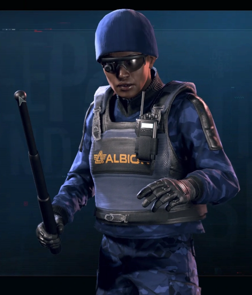 Denise Oke (born 1989) was a British Albion contractor. Born in Lagos, Nigeria, she wrote post-colonial poems, donated monthly to women's shelters, received close-quarter tactical training, underwent surgery to remove shrapnel, and was knocked out during DedSec operative Tracy Coyne's 2029 infiltration of the E-STROM building in Lambeth.