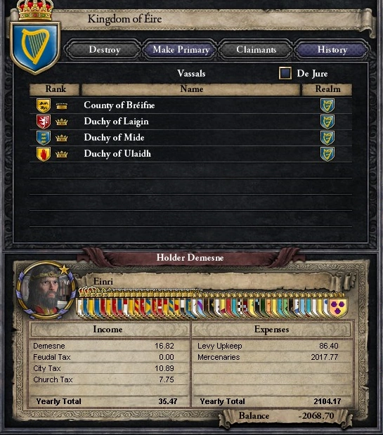 Einri Ua Conchobair was born in Gartan, Tyrconnell (in present-day County Donegal, Ireland) on 26 December 1038 to the Clan O'Connor of Tyrconnell. Einri came from a powerful family, and he married Orlaith, having several children with her. In December 1066, Einri became Earl of Tir Chonaill after seizing power from the previous ruling clan, and he was the first O'Connor of Tyrconnell to hold a noble title. Einri appointed an array of talented courtiers to court positions, and he sent his chancellor to fabricate claims on nearby states in order to acquire casus bellis on the other nobles. Einri succeeded in doing so, and he waged a series of campaigns of conquest from the 1060s to the 1080s. Einri subjected Tir Eoghain, Ulster, and Airgialla to Tyrconnellian rule, and he gave fiefs to his sons Eochaid of Ulaidh (ruler of Ulster) and Focarta of Airgialla. Einri would consolidate his realms to become the Petty King of Ulster on 14 November 1069, and he ruled over the northern parts of Ireland for years. From around 1069 to the mid-1080s, Einri's realm was at peace, and the people were happy under his rule.