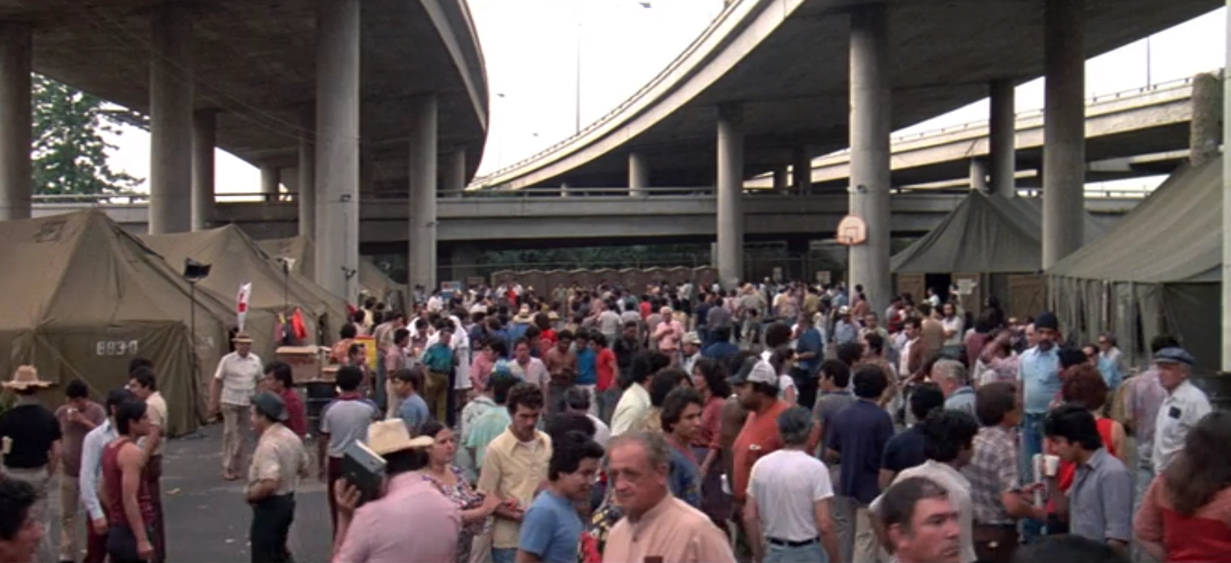 Freedomtown was a refugee camp for Cubans who came to Miami, Florida during the Mariel boatlift of 1980. Cubans who were not granted admission to the United States were kept in the camp, which became a "tent city" under a highway. The camp consisted of an administrative office, a mess tent for meals, a infirmary tent for the sick and infirm, and multiple tents with bunks for the refugees to reside. On 11 August 1980, the Freedomtown riots broke out in response to the US government's refusal to give green cards to its residents, and former communist official Emilio Rebenga was killed by Tony Montana during the riots. Between 1980 and 1983, the camp was decommissioned, with its residents either being granted US citizenship or deported back to Cuba. Its decommissioning was done poorly, and it was full of vacated, half-assembled tents along with plenty of discarded newspapers and glass bottles.