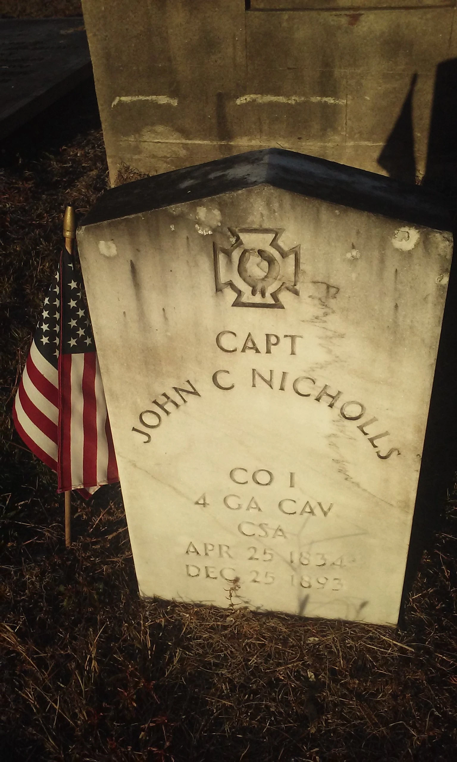 John Calhoun Nicholls was born in Clinton, Georgia in 1834, and he practiced law in Waynesville before serving in the 4th Georgia Cavalry Regiment during the American Civil War. After the war, he practiced law in Blackshear before serving in the state senate from 1870 to 1875 and in the US House of Representatives from 1879 to 1881 and from 1883 to 1885, and he died in 1893.