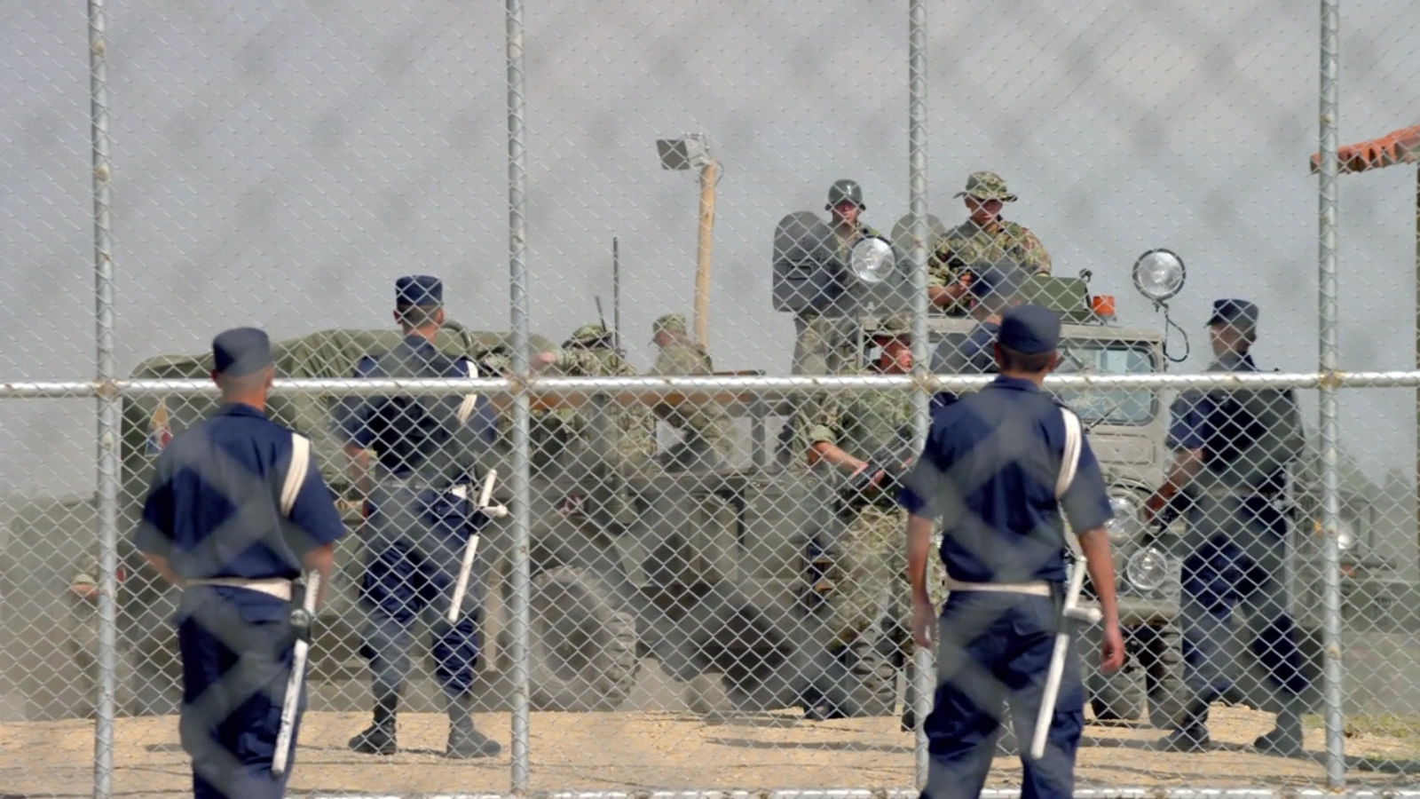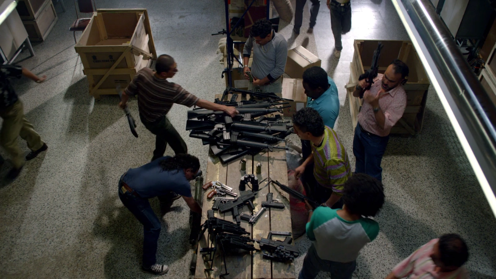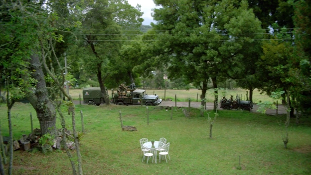 The Colombian Army trucks moved along the main road, and Escobar's wife Maria Henao called him to warn him of the army's arrival. The trucks stopped at the gates of the prison, and a robed Escobar looked down at the trucks and ordered his men to gather their weapons and prepare for a fight. General Ariza told his men that Lieutenant Dominguez would lead the men, and he gave him the authorization to shoot at the enemy if the soldiers were fired upon. The police formed a perimeter around the building, and the United States' Mil Group closely monitored the situation.