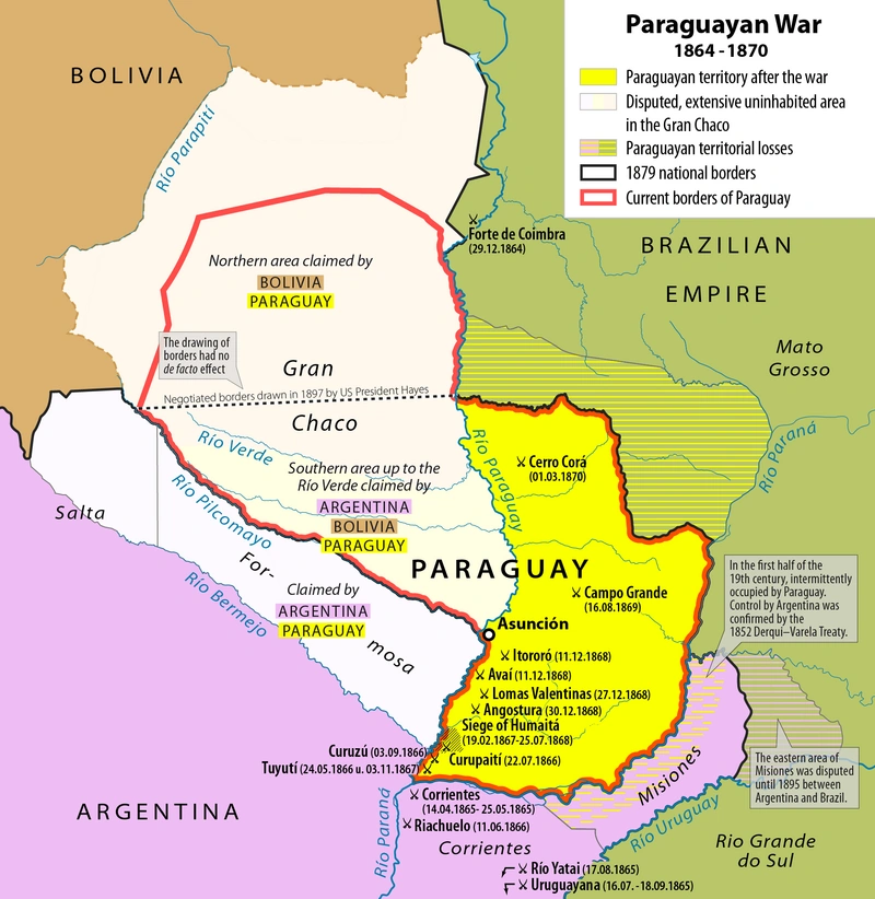 The Paraguayan War, also called the War of the Triple Alliance, was the bloodiest inter-state war in Latin American history, fought between Paraguay and the "Triple Alliance" of Brazil, Argentina, and Uruguay from 1864 to 1870. The war resulted in Paraguay losing two-thirds of its population, including 90% of its male population, as well as 40% of its prewar territories.