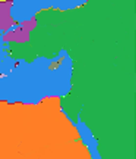Near East in 1073: green is The Turks, orange is the Fatimid Empire, and purple is the Byzantine Empire.
