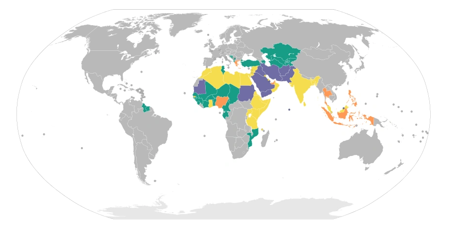 Countries that adhere to sharia law: green means that sharia is not in the judicial system, yellow refers to sharia in personal lives, blue means full sharia law in public and private life, and orange means that there are regional variations