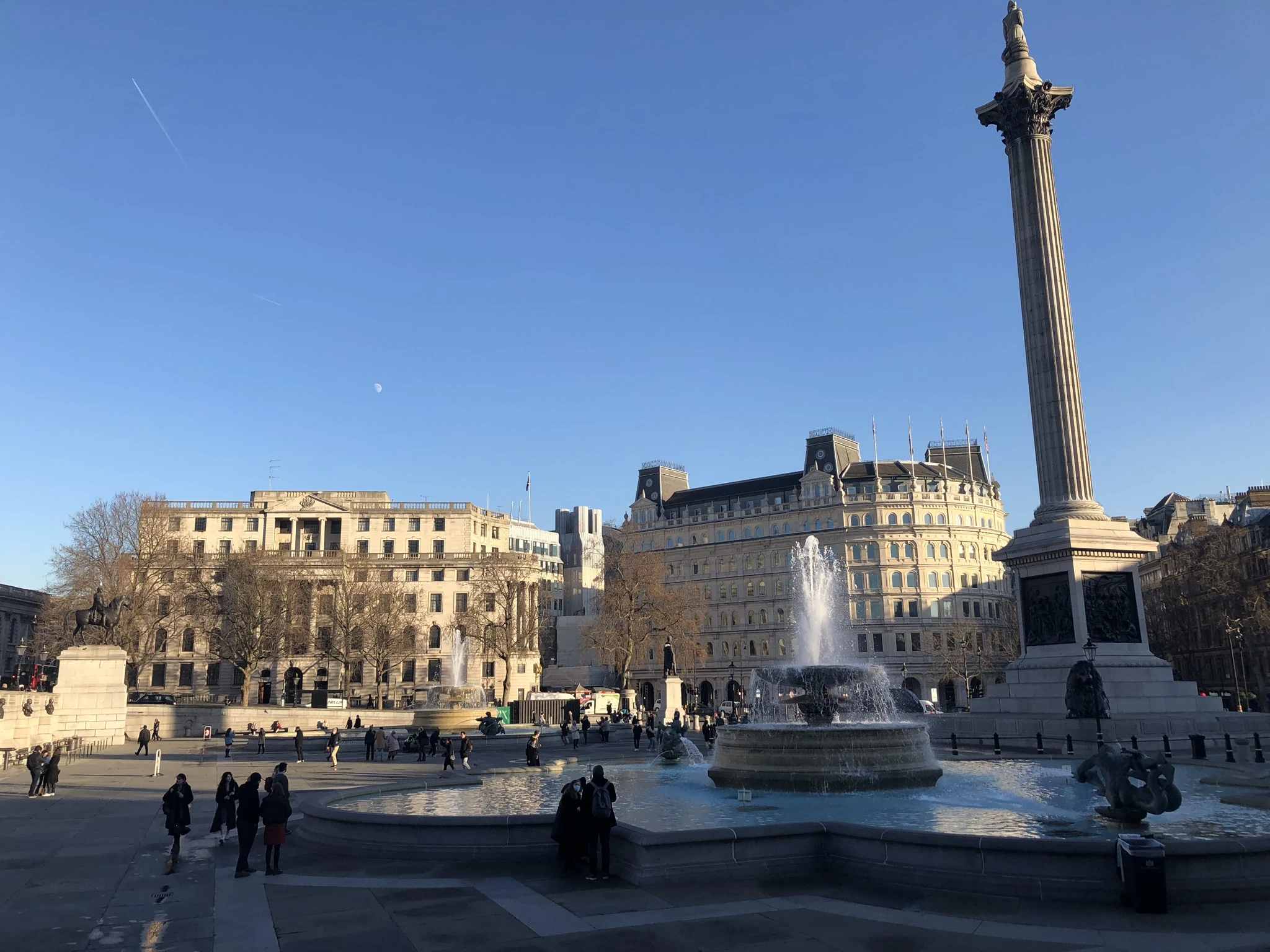 Trafalgar Square is a public square in Westminster, London, England. It was built around the area formerly known as Charing Cross, and it opened in 1844; it was named to commemorate the British victory at the naval Battle of Trafalgar on 21 October 1805 during the Napoleonic Wars. The 169-foot Nelson's Column at its center is guarded by four lion statues, and a number of commemorative sculptures and statues occupy the square.