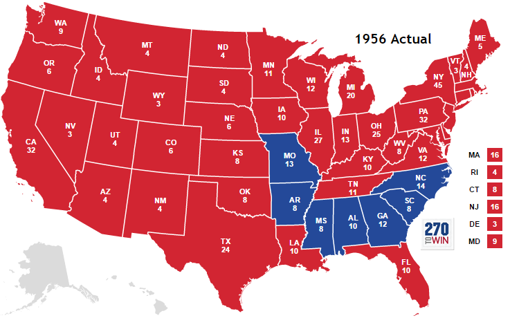 The United States presidential election, 1956 was held on 6 November 1956. The election was a rematch of 1952, with the incumbent Republican Party president Dwight D. Eisenhower and his running mate Richard Nixon facing off against Democratic Party nominee Adlai Stevenson II and his running mate Estes Kefauver. The likeable Eisenhower, who had enjoyed popularity in his last term, gained more support due to the growth of the suburbs (typically Republican strongholds), and he maintained the support of white urban southerners and northern Catholics that he had gained from the Democrats four years earlier. Stevenson won only in the Solid South, and Eisenhower won the election with 457 electoral votes to Stevenson's 73 votes.