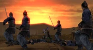 Zhang Fei (167-August 221 AD) was a general serving under Liu Bei during the late Han period and the early Three Kingdoms era. He, Liu Bei, and Guan Yu became sworn brothers in 184 AD, and they swore to die together. However, Guan Yu died at the Battle of Fan Castle in 219 AD after Sun Quan betrayed Liu Bei, and, two years later, Zhang Fei was assassinated by defectors in his army who promptly fled to Sun Quan's lands.